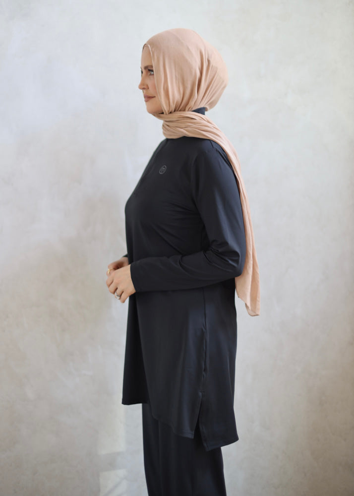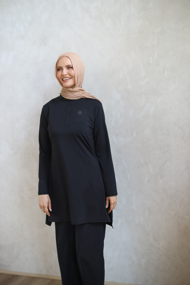 Designed to move comfortably with the body, offering added ease where it matters most, our Half-Zip Modest Dress is a refined essential created for confident coverage and effortless style. Featuring a long, relaxed silhouette, the design drapes fluidly and remains non-clingy, allowing for natural movement while maintaining a flattering, elevated look. Lightweight yet substantial, it delivers comfort and elegance in equal measure.